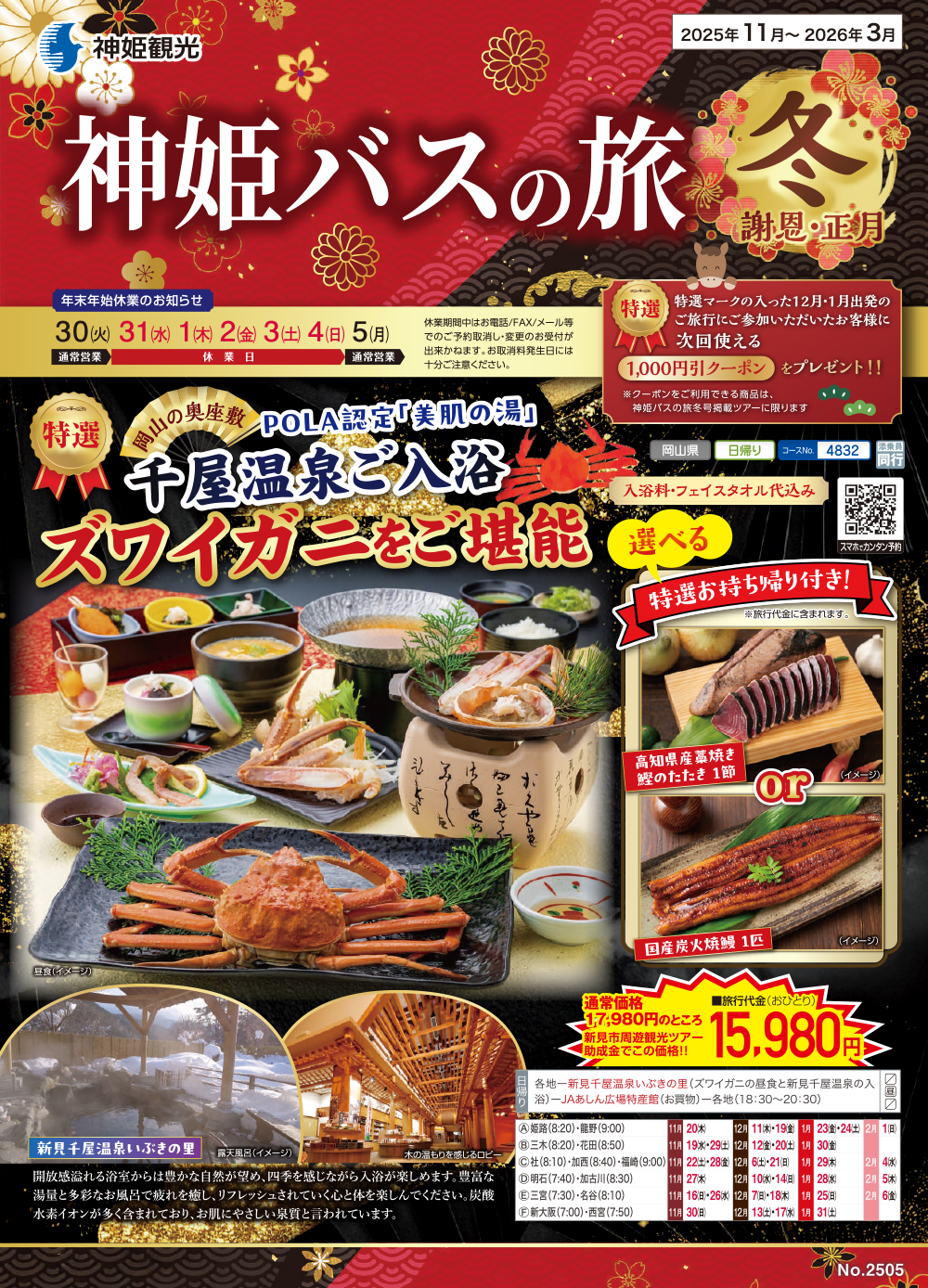No.4832POLA認定「美肌の湯」入浴料・フェイスタオル代込み岡山の奥座敷千屋温泉ご入浴 ズワイガニをご堪能 選べる特選お持ち帰り付き!