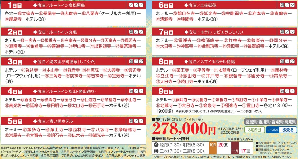 神姫観光ではお忙しいお客様のために、9日間で一気に八十八ヶ所を周るコースをご用意いたしました。この機会に是非ご参加ください。