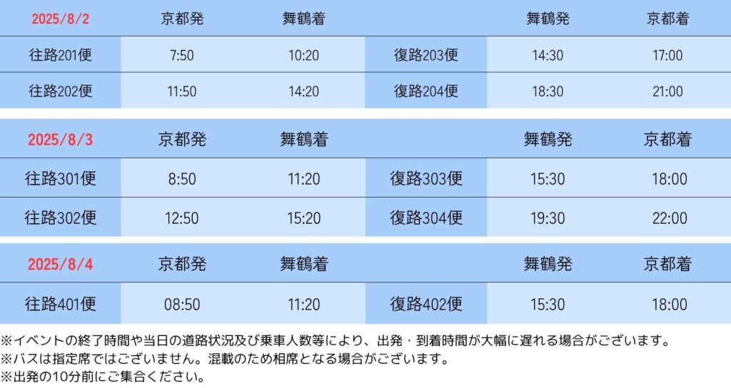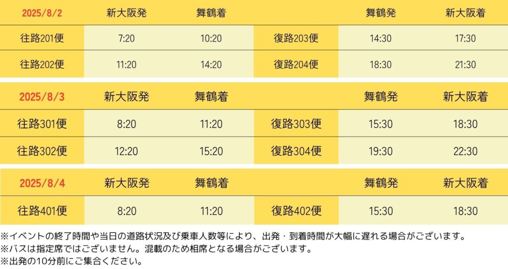 - ・イベントの終了時間や当日の道路状況及び乗車人数等により、出発・到着時間が大幅に遅れる場合がございます。
