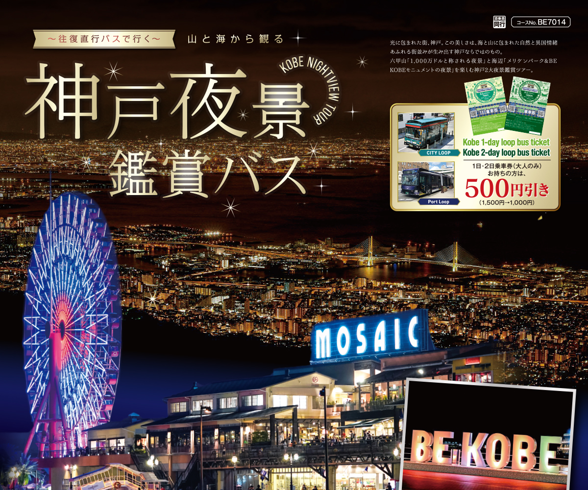 光に包まれた街、神戸。この美しさは、海と山に包まれた自然と異国情緒あふれる街並みが生み出す神戸ならではのもの。 六甲山「1,000万ドルと称される夜景」と海辺「メリケンパーク&BE KOBEモニュメントの夜景」を楽しむ神戸2大夜景観賞ツアー